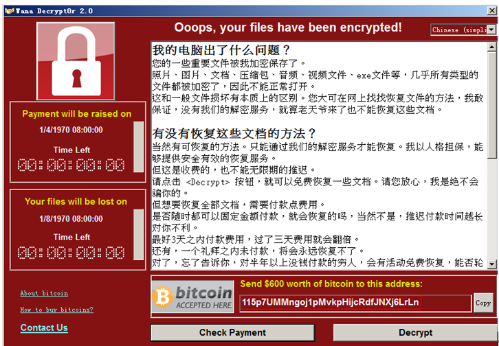 2017年(nián)5 月(yuè)12 日(rì)晚上(shàng)20 時(shí)左右,全球爆發大(dà)規模蠕蟲勒索軟件(jiàn)感染事(shì)件(jiàn),僅僅幾✘個(gè)小(xiǎo)時(shí)內(nèi),該勒索軟件(jiàn)已經攻擊了(le)99個(gè)國(guó)家(jiā)近(j∏ìn)萬台電(diàn)腦(nǎo)。英國(guó)、美(měi)國(guó)、俄羅斯、德國(guó)、土(tǔ)耳其、意大(dà)利、中國(guó)、₽菲律賓等國(guó)家(jiā)都(dōu)已中招,且攻擊仍在蔓延。