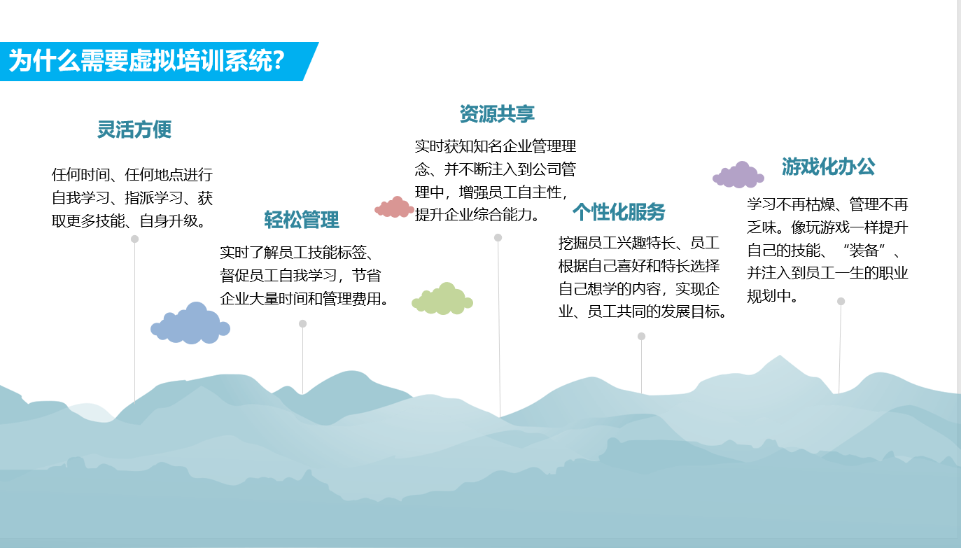 讓每一(yī)個(gè)工(gōng)作(zuò)者、每一(yī)個(gè)崗位都(dōu)能(néng)參與到(dào)“虛拟培訓理(lǐ)念中”。打消新人(rén)入職迷茫,提高↕(gāo)主觀意識,自(zì)主接“任務”,完成“任務”。